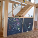 デッキに面するフルオープンのサッシを介してデッキも室内の一部のように広く感じることができます。LDKからはデッキの向こう側に庭や家庭菜園の緑を眺めることができます。