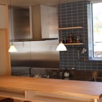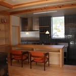 シンプルにステンレスの業務用キッチンを並べた台所の窓からは住まい手さんの好きな水晶山(すいしょうざん)を眺めることができます。外壁は全面杉板張り、壁と屋根の断熱材はセルロースファイバー、2階の壁の仕上げは住まい手さんご自身のDIYによるほたてしっくい塗り、薪ストーブ 、薪ボイラー、壁掛けエアコンによる床下暖房など こだわりいっぱいです。
