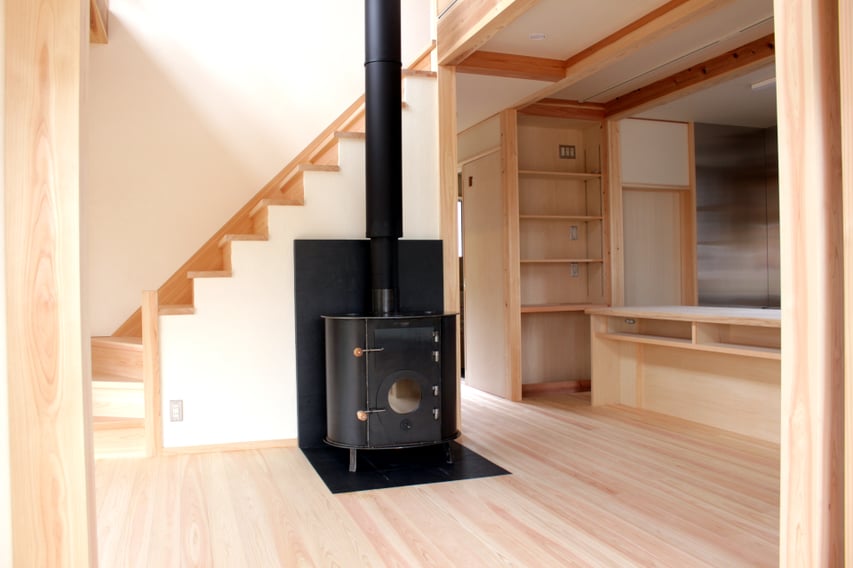 延べ床面積28坪の4人家族のお住まいです。農作業や農産物の加工をするためのスペースを確保するために、あえて玄関を設けませんでした。住まい手さんこだわりの薪ストーブのある吹き抜けを家の中心に、すべてをコンパクトながらワンルームのようにLDKを配置しました。