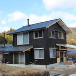 シンプルにステンレスの業務用キッチンを並べた台所の窓からは住まい手さんの好きな水晶山(すいしょうざん)を眺めることができます。外壁は全面杉板張り、壁と屋根の断熱材はセルロースファイバー、2階の壁の仕上げは住まい手さんご自身のDIYによるほたてしっくい塗り、薪ストーブ 、薪ボイラー、壁掛けエアコンによる床下暖房など こだわりいっぱいです。